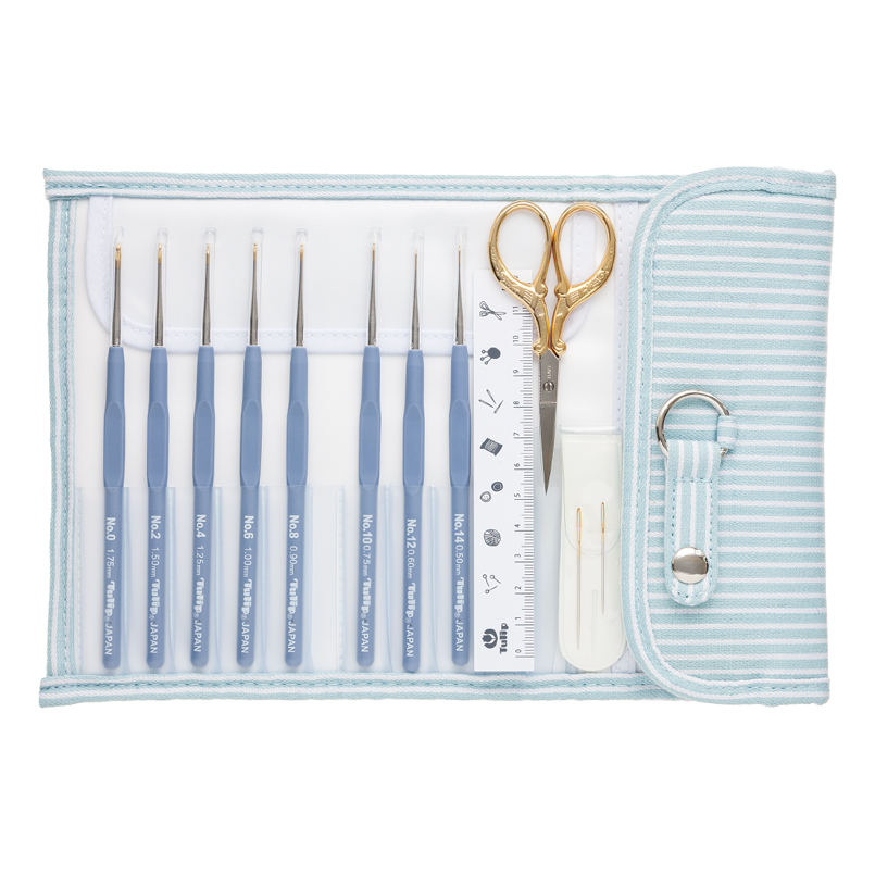 This set of products, including eight crochet hooks, a pair of high-grade scissors made in Italy, an adorable case, two yarn needles, and a ruler, is useful and offers a price advantage.